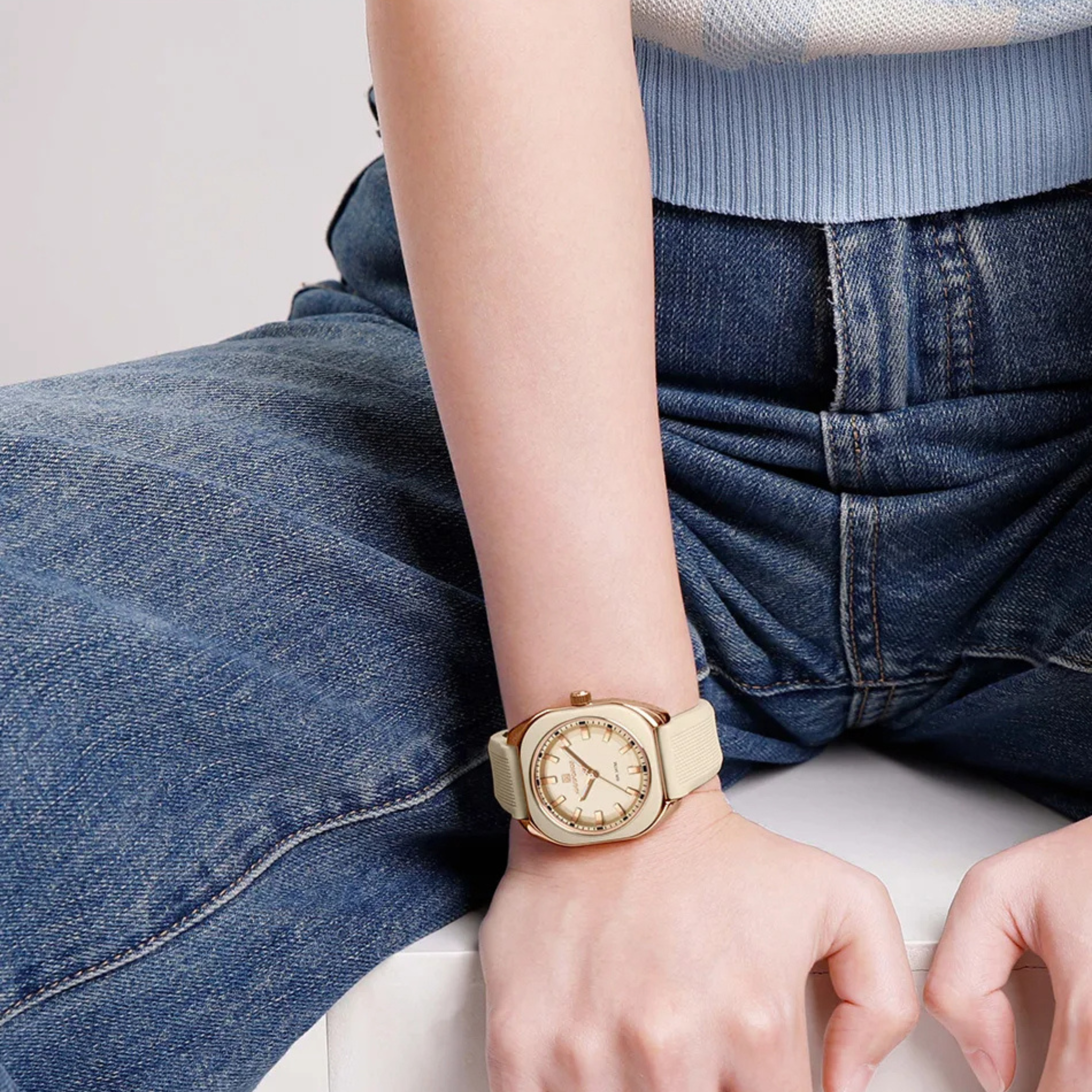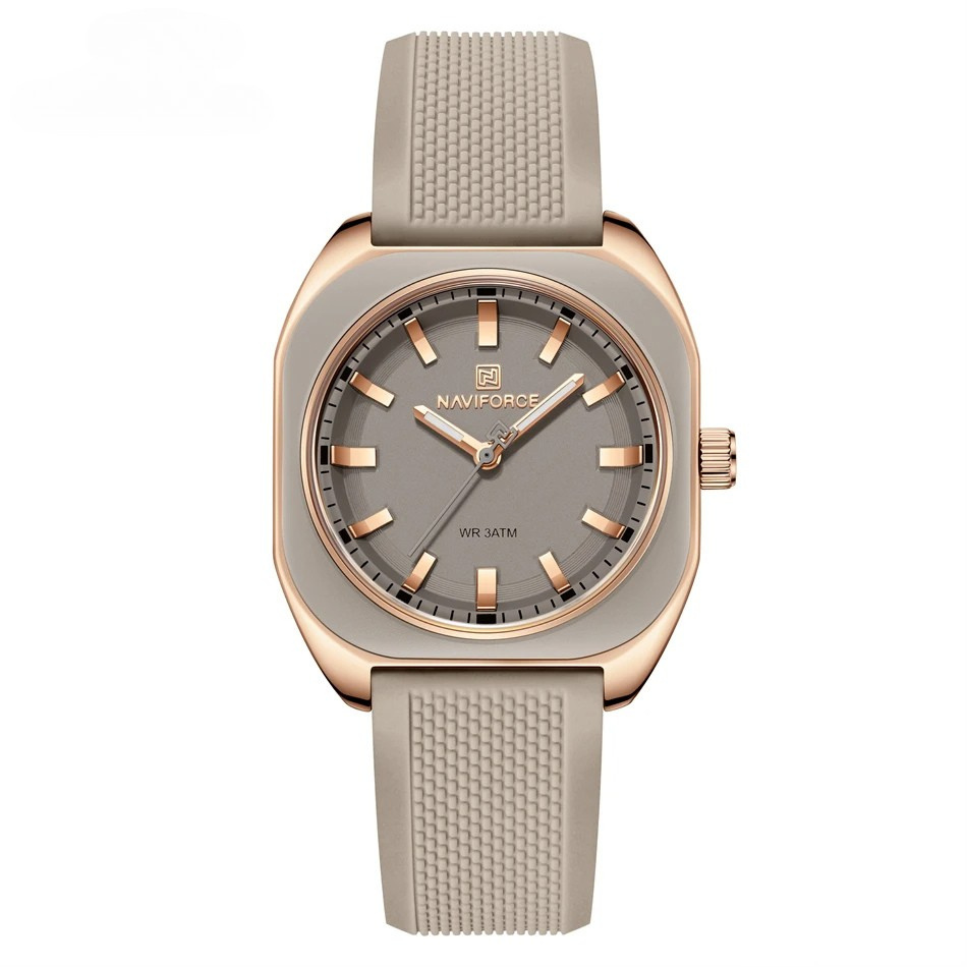 Encased in a sleek rose gold-tone frame, this timepiece features a bold yet minimalist dial with luminous markers for enhanced visibility. The ultra-comfortable silicone strap ensures a perfect fit for all-day wear, while a range of refined color choices make this watch your perfect companion for work, leisure, and beyond.